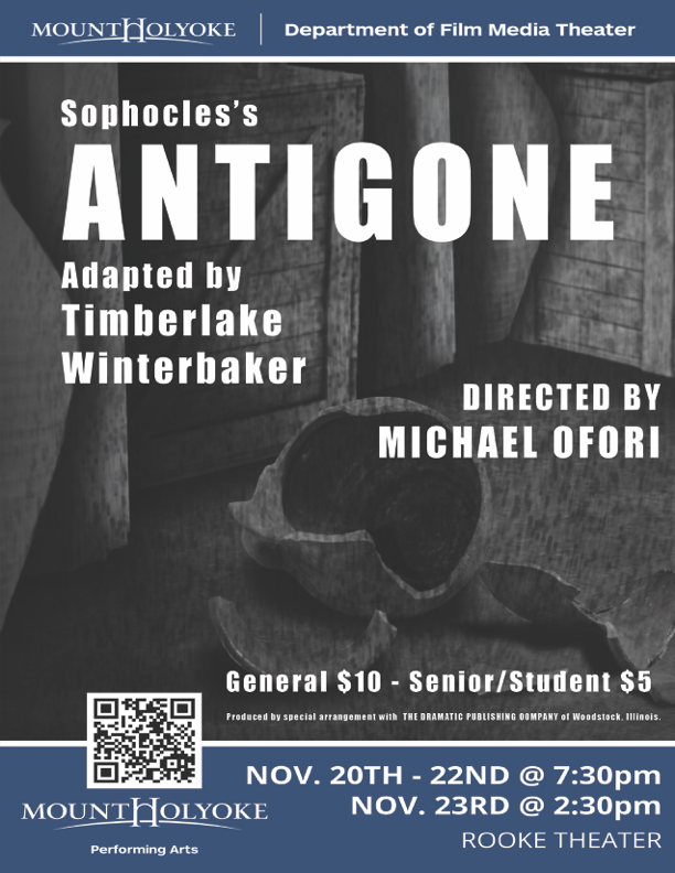 The Mount Holyoke College Department of Film Media Theater proudly presents Sophocles’s “Antigone” adapted by Timberlake Winterbaker, produced by special arrangement with THE DRAMATIC PUBLISHING COMPANY of Woodstock, Illinois.