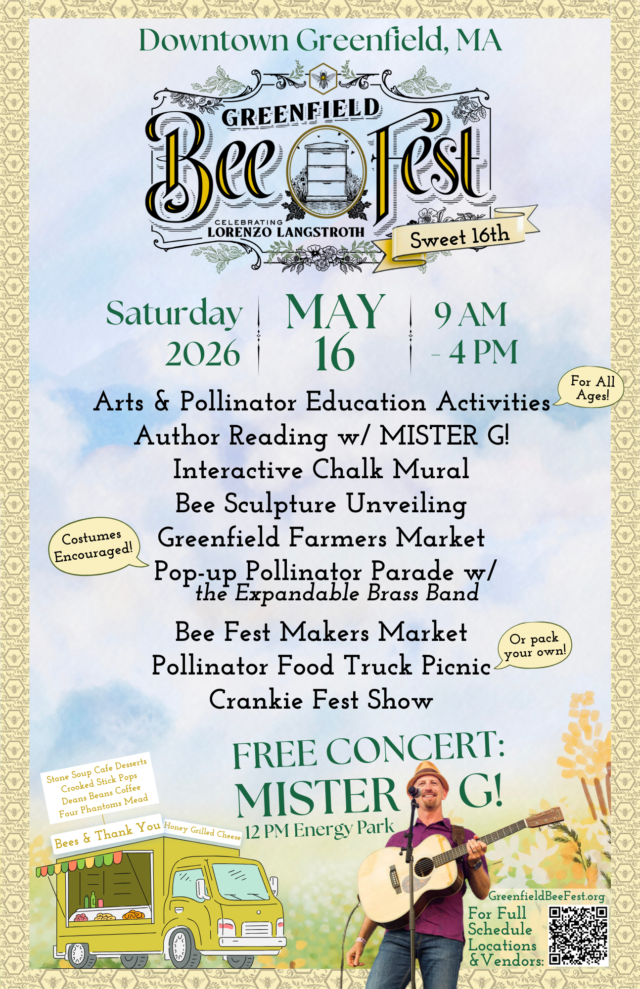 It’s the Sweet Sixteenth year for the Greenfield Bee Fest, and this year things will be absolutely BUZZING – with more artsy educational fun, more celebration, more vendors, and even a SPECIAL GUEST musical appearance from MISTER G!