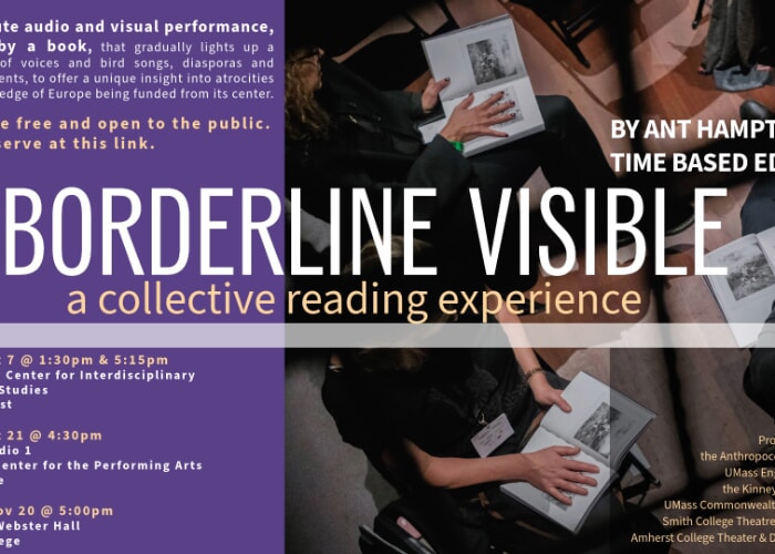 Join us for a performance of *Borderline Visible* by the German-British artist Ant Hampton / Time Based Editions, which will be held at UMass Amherst, Smith College, and Amherst College on Oct 7, Oct 21, and Nov 20, respectively.
