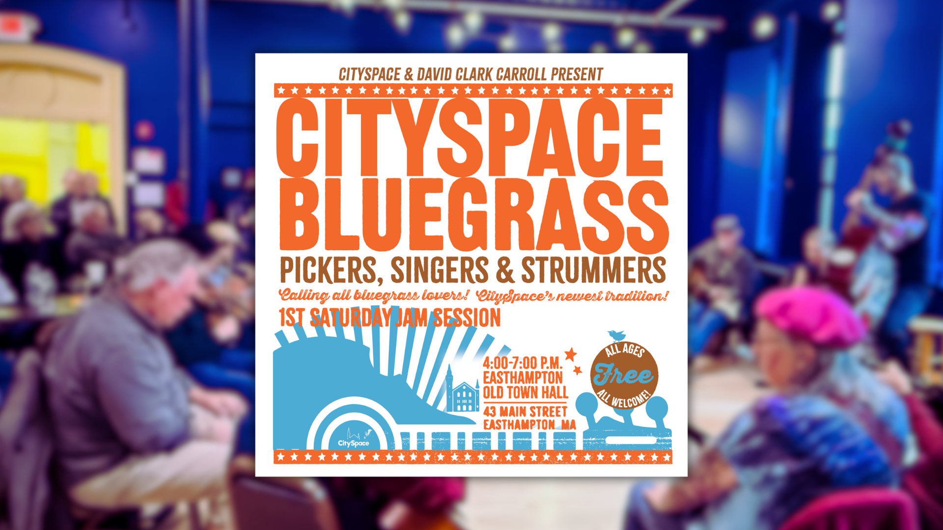 Calling all bluegrass lovers! Come on down to Easthampton Old Town Hall for an open bluegrass jam! Dust off your favorite Bill Monroe, Stanley Brothers and beyond songs, and scratch the itch to pick at the launch of a monthly jam! Bluegrass musician David Clark Carroll and CitySpace presents CitySpace Bluegrass, a new monthly bluegrass jam designed to bring the community together in the spirit of music, joy, and good old-fashioned fun.