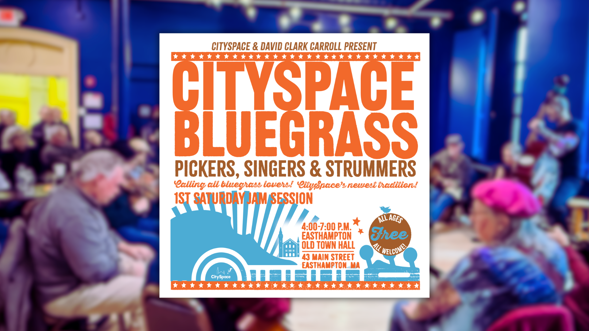 Join bluegrass musician David Clark Carroll and CitySpace for a fun, open bluegrass jam! Bring your instruments and your favorite tunes — from Bill Monroe to the Stanley Brothers and beyond. Held every first Saturday of the month during Art Walk Easthampton, this monthly jam brings the community together for music, connection, and good old-fashioned fun.