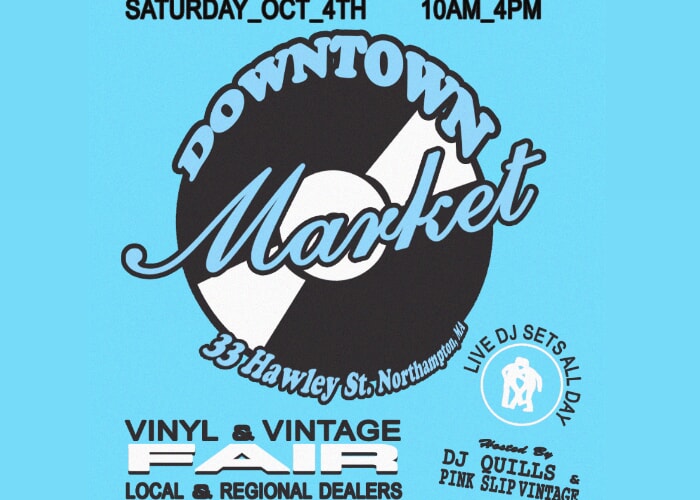 On Saturday October 4, DOWNTOWN MARKET Vintage & Vinyl is back for its second annual fair at 33Hawley, The Northampton Center for the Arts building in downtown Northampton, MA. The event will feature two rooms with thousands of records and tons of vintage deals for sale from local and regional dealers, plus a variety of live vinyl DJs spinning throughout the day. $5 Early Admission from 10am-1pm includes a raffle ticket. Raffle drawing at 1:30pm. Free Admission from 1pm-4pm. Free Parking is available in the 33Hawley Lot. Vendors Include: Spin That! Records, Studebaker Hawk, Dr. Vinyl, Sunday Vintage, Hellmouth Used Goods, Tidy Cat Vinyl, Gee’s Records, Tag Snapper Vintage, Sleepy Jean Records, Flower Sounds & many more! Hosted by DJ Quills @mcquills and Pink Slip Vintage @pinkslip_vintage Poster by Josh Jenkins @iosnua on Instagram