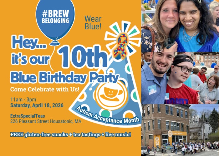 Come to ExtraSpecialTeas Blue Birthday Party (blue is for autism awareness, understanding and acceptance), which runs from 11:00 am – 3:00 pm on Saturday, April 18 at 226 Pleasant Street in Housatonic, MA. All community members are invited to wear blue, post party pictures to their social media (tag @extraspecialteas #lightitupblue #brewbelonging) and come into the teahouse to sample an “ExtraSpecial” brew of our signature blue tea named “Blue Skies,” and sample gluten-free brownie bites made by ExtraSpecial Servers and staff. Hot, iced and bubble teas are always available for purchase!