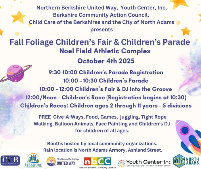 Fall Foliage Children’s Fair & Parade Saturday, October 4th 9:30 AM – 1:00 PM Municipal Field at the Noel Field Complex ✨ Schedule of Events ✨ 9:30 AM – Children’s Parade Registration 10:00 AM – Children’s Parade 10:00 AM – 12:00 PM – Children’s Fair 12:00 PM – Children’s Race (Ages 2–11, 5 divisions) Join us for a day full of fun! There will be free giveaways, food, games, juggling, tightrope walking, balloon animals, face painting, and a children’s DJ! Bring the whole family for a magical fall celebration in North Adams – you won’t want to miss it!