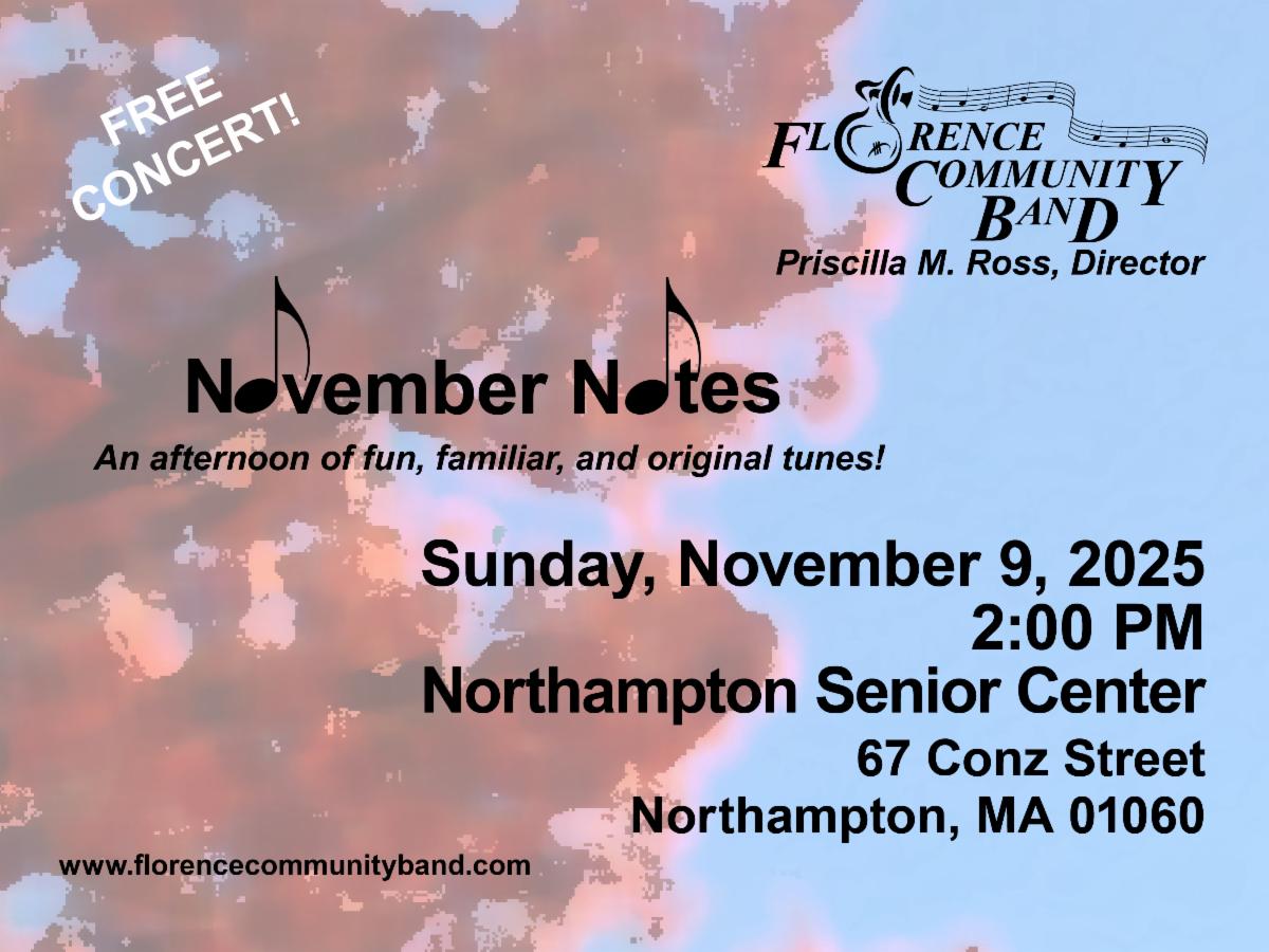 The Florence Community Band invites you to its November Notes Concert! This free performance will take place at the Northampton Senior Center, 67 Conz St, on Sunday, November 9, at 2 pm. Please join us for an afternoon of music, with favorites ranging from Cole Porter, Pirates of the Caribbean, and the hit musical Hamilton.