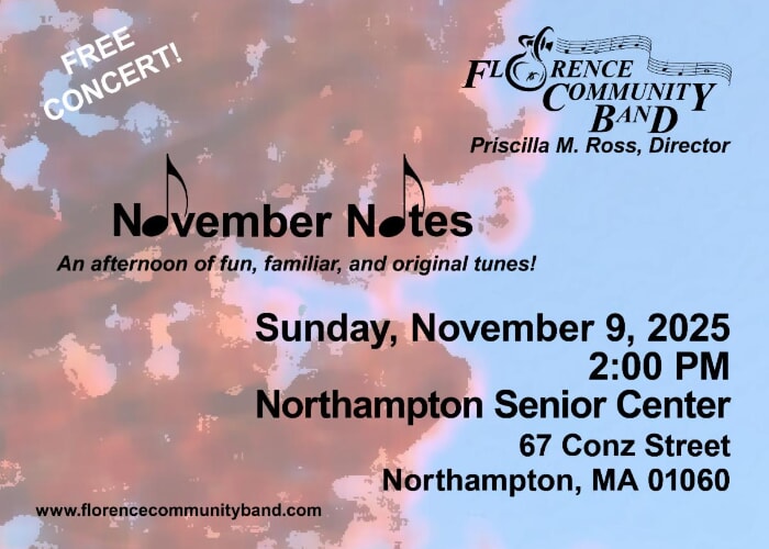 The Florence Community Band invites you to its November Notes Concert! This free performance will take place at the Northampton Senior Center, 67 Conz St, on Sunday, November 9, at 2 pm. Please join us for an afternoon of music, with favorites ranging from Cole Porter, *Pirates of the Caribbean*, and the hit musical *Hamilton*.