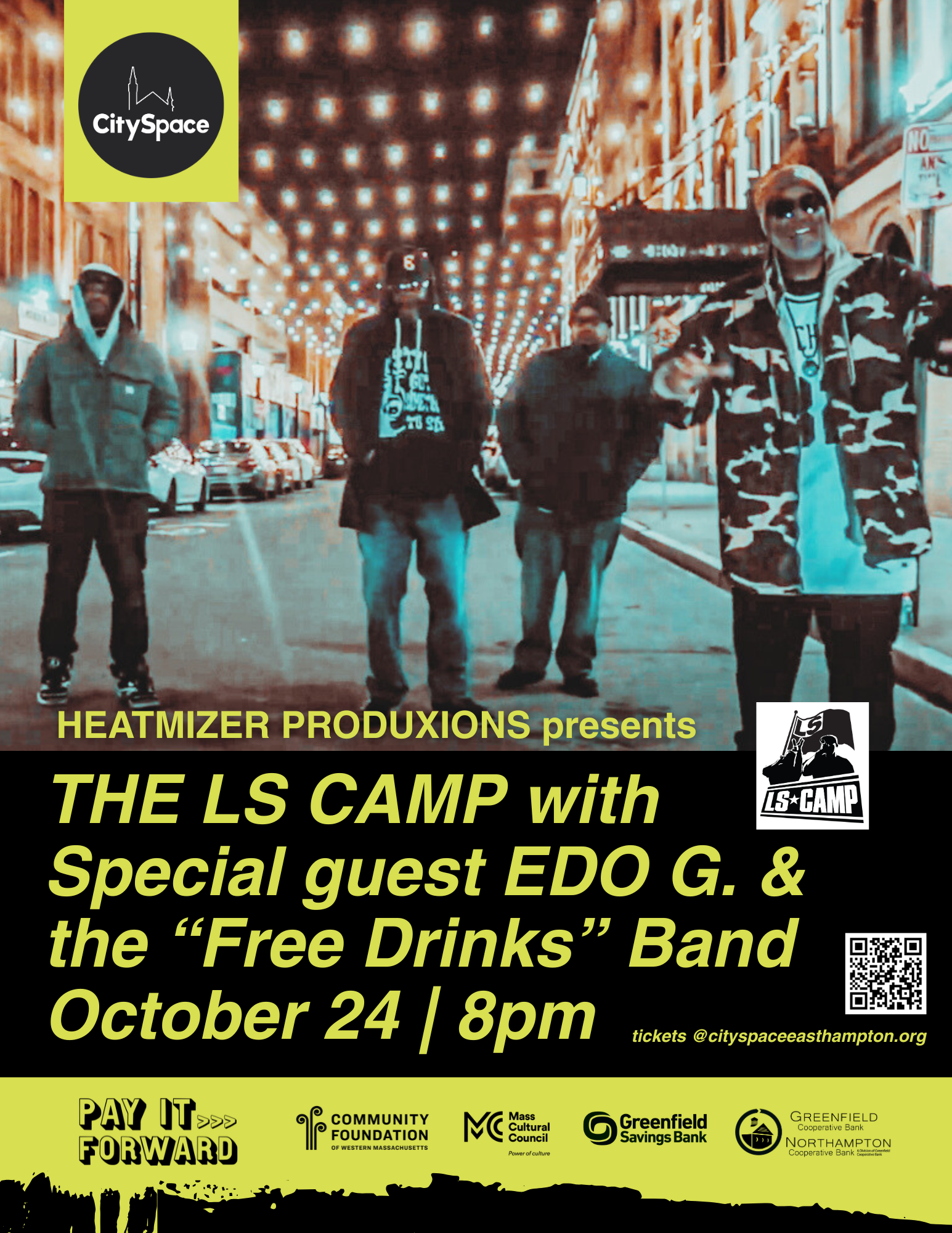 CitySpace and HEATMIZER PRODUXIONS presents THE LS CAMP with Special guest EDO G. October 24, 2025, in CitySpace’s Blue Room at Old Town Hall, 43 Main St., Easthampton, MA. Doors open at 7:30pm and the performance begins at 8pm.