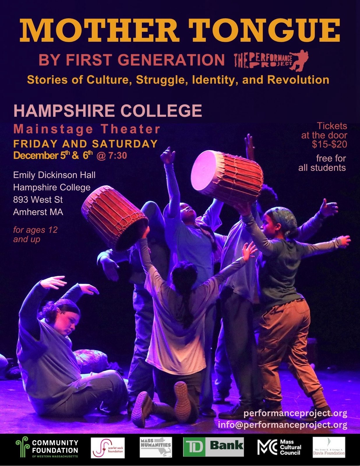 “Mother Tongue” is an original multilingual physical theater performance created by the Performance Project’s First Generation Ensemble. The piece highlights local and global social justice issues, and is inspired by the lived experiences of Ensemble members, their families, and communities. The Ensemble originates from Congo/Tanzania, Bhutan/Nepal, South Sudan/Darfur, Puerto Rico, Holyoke, and Springfield, MA. The 90 minute performance weaves together movement, music, dance, theater, and stories in Arabic, Swahili, Nepali, Spanish, and English and incorporates themes of language, culture, identity, diaspora, hypermasculinity, transphobia, racism, education, the school to prison pipeline, personal liberation and revolution. Appropriate for ages 12 and up.
