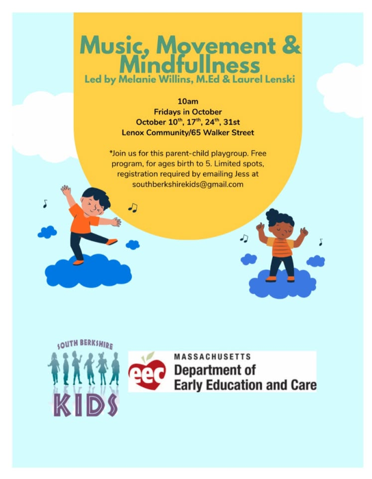 Join us for this parent-child playgroup. Free program, for ages birth to 5. Limited spots, registration required by emailing Jess at southberkshirekids@gmail.com