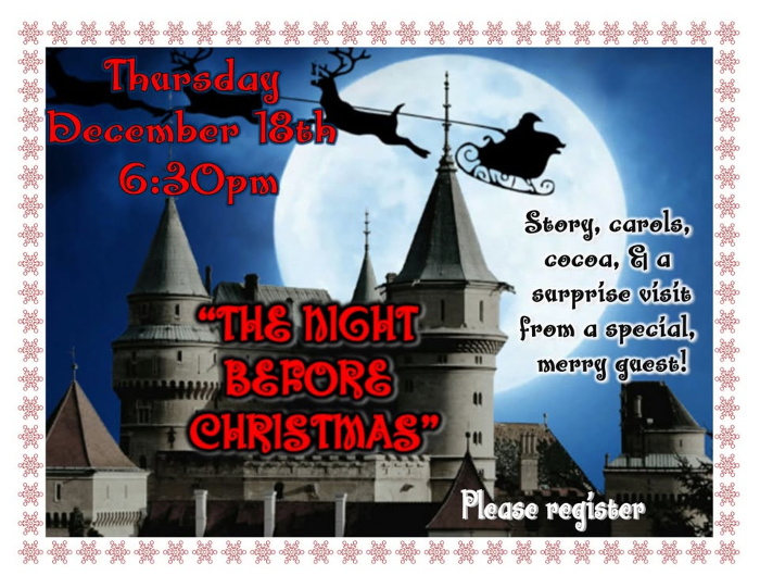 Kids wear their pajamas to hear the famous story by Clement c. Moore, then sing carols and drink cocoa, followed by a surprise visit from a very special, merry guest!