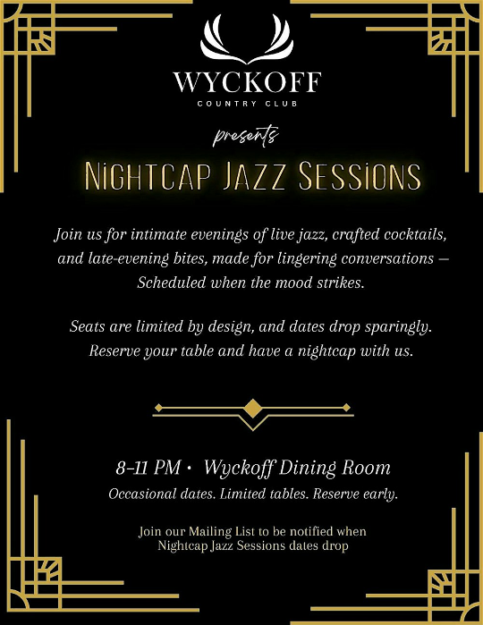 Intimate pop-up sessions from 8 -11 pm in the Wyckoff dining room-live jazz, craft cocktails, small plates & limited tables. Reserve early.