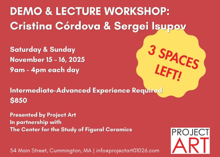 This November, Project Art and The Center for the Study of Figurative Ceramics invite you into an immersive, two-day encounter with two of contemporary ceramics most influential figural sculptors: Cristina Cordova and Sergei Isupov. Participants are invited to spend the weekend observing the two artists’ alternating sessions, learn from their interactions and participate in active conversations between artists and participants. This is a great opportunity for sculptors interested in expanding their skills and making connections with the two artists and other participants.