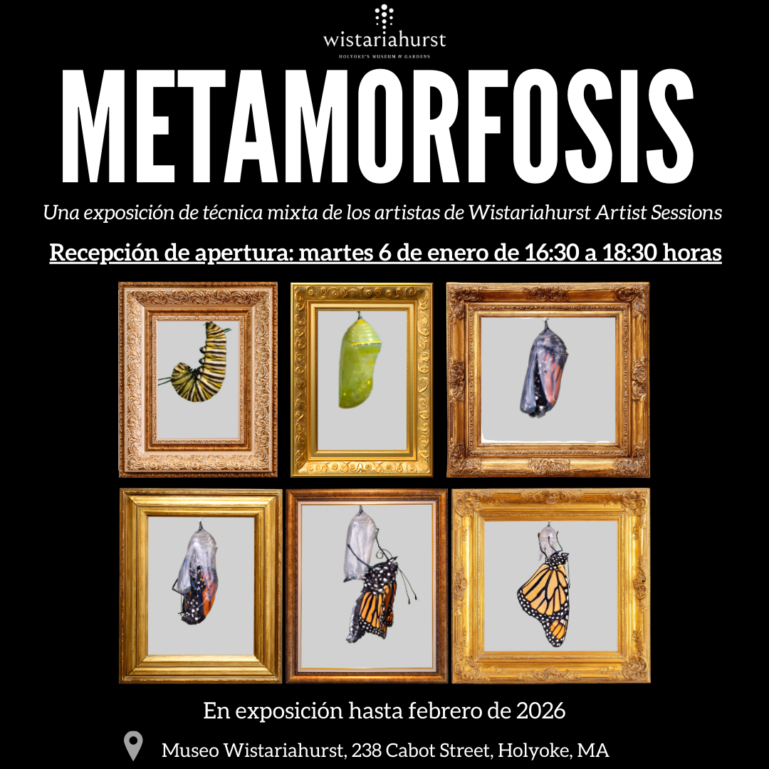 El Museo Wistariahurst se complace en anunciar la próxima exposición Metamorphosis, que se inaugurará el 6 de enero de 2026. Esta exposición presenta a artistas que han asistido a una o más de las sesiones de artistas celebradas en el Museo Wistariahurst. Estas sesiones, dirigidas por la artista y voluntaria Linda Devine, sirven como una forma para que los artistas locales establezcan contactos, compartan su trabajo entre ellos y se desarrollen como artistas. Las sesiones artísticas se han celebrado mensualmente desde enero de 2025, y el grupo de artistas ha reforzado sus habilidades en cada sesión. Para celebrar el crecimiento que estos artistas han experimentado durante el último año, expondrán sus obras en la galería de Wistariahurst. Metamorphosis tiene como tema el cambio, que cada artista ha interpretado a su manera a través de varios medios, desde la pintura y la escultura hasta la escritura. Los artistas expresan temas de cambio personal, cambios en la naturaleza, la moda, la cultura y mucho más.
