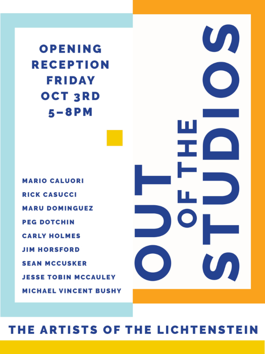 Out of the Studio showcases artists who have studios at the Lichtenstein Center for the Arts: Mario Caluori; Rick Casucci; Maru Dominguez; Peg Dotchin; Carly Holmes; Jim Horsford; Sean McCusker; Jesse Tobin McCauley and Michael Vincent Bushy, each contributed original artwork spanning multiple genres—from painting to pottery to photography and bookmaking!