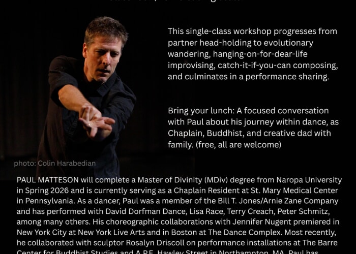 This single-class workshop progresses from partner head-holding to evolutionary wandering, hanging-on-for-dear-life