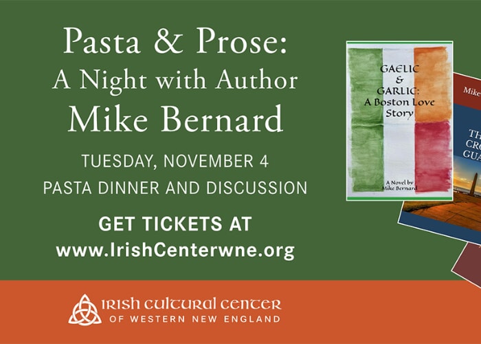 The Irish Cultural Center presents a special evening with Mike Bernard, author of the ‘Boston Irish Belt Trilogy’ novels. Join us on Tuesday, November 4 for a discussion including his local inspirations, writing process, Hollywood screenplay adaptations, Irish Catholic guilt and passive aggressive mothers (definitely not his own!). The evening also includes a delicious pasta dinner buffet in honor of his novel Gaelic & Garlic: A Boston Love Story (last month’s ICC Book Club choice).
