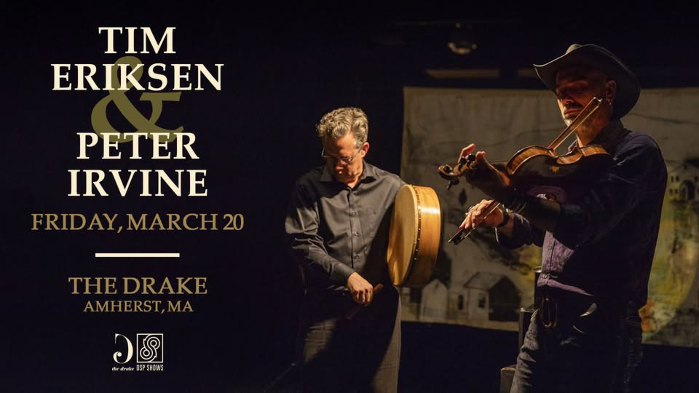 DSP Shows Presents: Tim Eriksen & Peter Irvine Friday, March 20, 2026 The Drake | Amherst, MA Tim Eriksen is a songwriter whose work has been covered by Alison Krauss, Bonny “Prince” Billy and Joan Baez, a ballad singer given the Jean Ritchie Musical Heritage Award by Ritchie herself, a prominent shapenote singer whose work appears in The Sacred Harp and a hardcore punk musician with a degree in South Indian veena. The long collaboration between Eriksen and percussionist Peter Irvine has included Bosnian ensemble Žabe I Babe and folk/noise trio Cordelia’s Dad, the only band to have appeared with both Doc Watson and Nirvana. In April 2026 Eriksen and Irvine will see the release of their first duo album on the audiophile label Soundkeeper Recordings. Absence and her sister is a dreamstate exploration of new and traditional music from an imaginary New England village. Eriksen’s film work includes the Oscar winning Cold Mountain and 2023 indie-horror phenomenon The Outwaters. His live performances bring together a range of sounds from his multiple musical lives: traditional banjo, fiddle and song from New England and southern Appalachia, family music from ex-Yugoslavia, moments tinged with punk rock, new music for his one-of-a-kind fretless bajo sexto and songs for fretless banjo written for his collaboration with pianist Omar Sosa in a follow up to their twice GRAMMY nominated 2009 album Across The Divide. Tim Eriksen is: --“otherworldly”- Barbara Kingsolver --“the best ballad singer of his generation”- BBC Radio 2 --“loud”- The New York Times