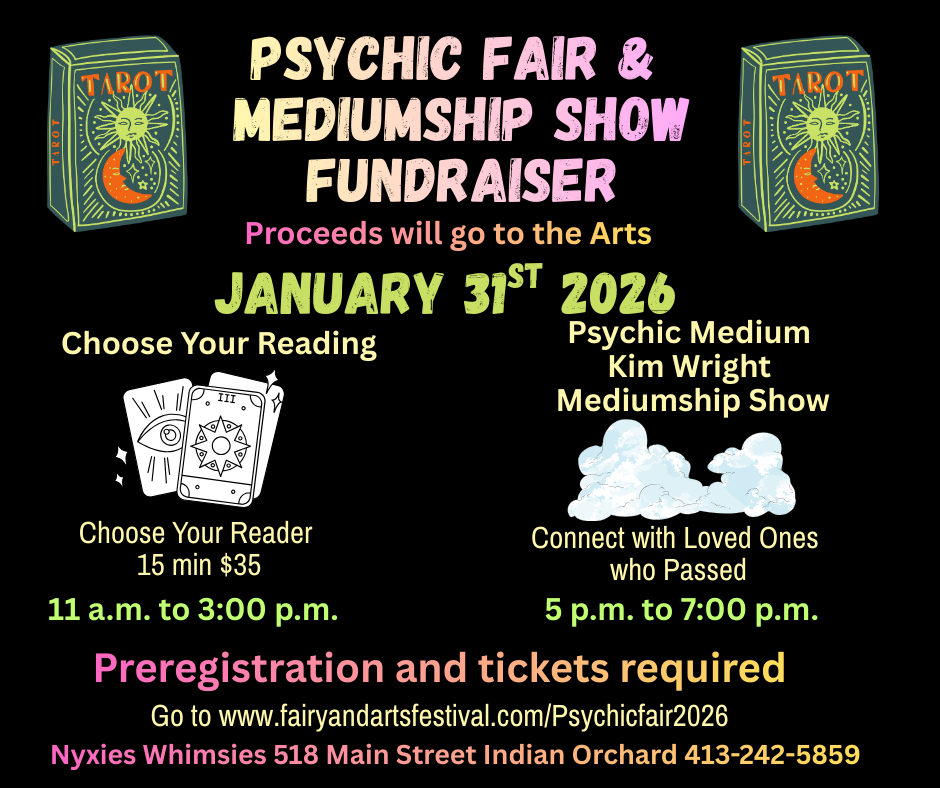 Psychic Fair and Mediumship Show Fundraiser for the Arts - Enjoy a day of messages at Nyxies Whimsies. Choose from an array or Tarot Readers and Psychics to get a reading. $35 per reading. Connect with Loved Ones from 5-7 p.m. with our Mediumship Show. Limited Seating $35 per ticket. Pre-register at the Psychic Fair on https://www.fairyandartsfestival.com/general-7