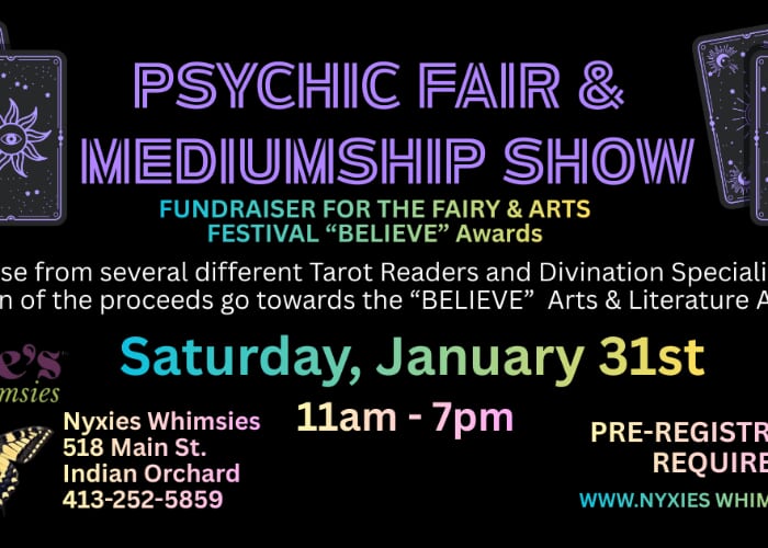 Psychic Fair and Mediumship Show Fundraiser for the Arts - Enjoy a day of messages at Nyxies Whimsies. Choose from an array or Tarot Readers and Psychics to get a reading. $35 per reading. Connect with Loved Ones from 5-7 p.m. with our Mediumship Show. Limited Seating $35 per ticket. Pre-register at the Psychic Fair on https://www.fairyandartsfestival.com/general-7