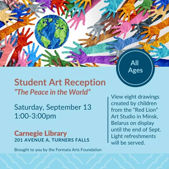 View eight drawings created by children from the Red Lion Art Studio in Minsk, Belarus, on display until the end of September. Light refreshments will be served at the reception. Brought to you by the Fermata Arts Foundation. --- The Carnegie Library is located at 201 Avenue A in Turners Falls, MA. Those taking public transit can reach the Library by taking the FRTA Bus Routes 22, 24, or 32 to the Food City stop or by taking FRTA’s Route 23 to the Ave A and 3rd Street stop: https://frta.org/getting-around/schedules-maps/ The Carnegie Library has one accessible parking space, located on the 7th Street side of the building (to the left side, if you’re facing the front of the building). The Library is accessible by wheelchair ramp, accessed down the driveway off of the 7th Street side of the building. There is an automatic door at the top of the ramp. There is a restroom, but the entrance to it is not ADA compliant. The Montague Public Libraries welcome individuals with disabilities to participate in its programs and activities. If you would like to request accommodations or have questions about the physical access provided, please contact library director, Caitlin Kelley, at librarydirector@montague-ma.gov or 413-863-3214 ext. 6 in advance of your participation or visit.