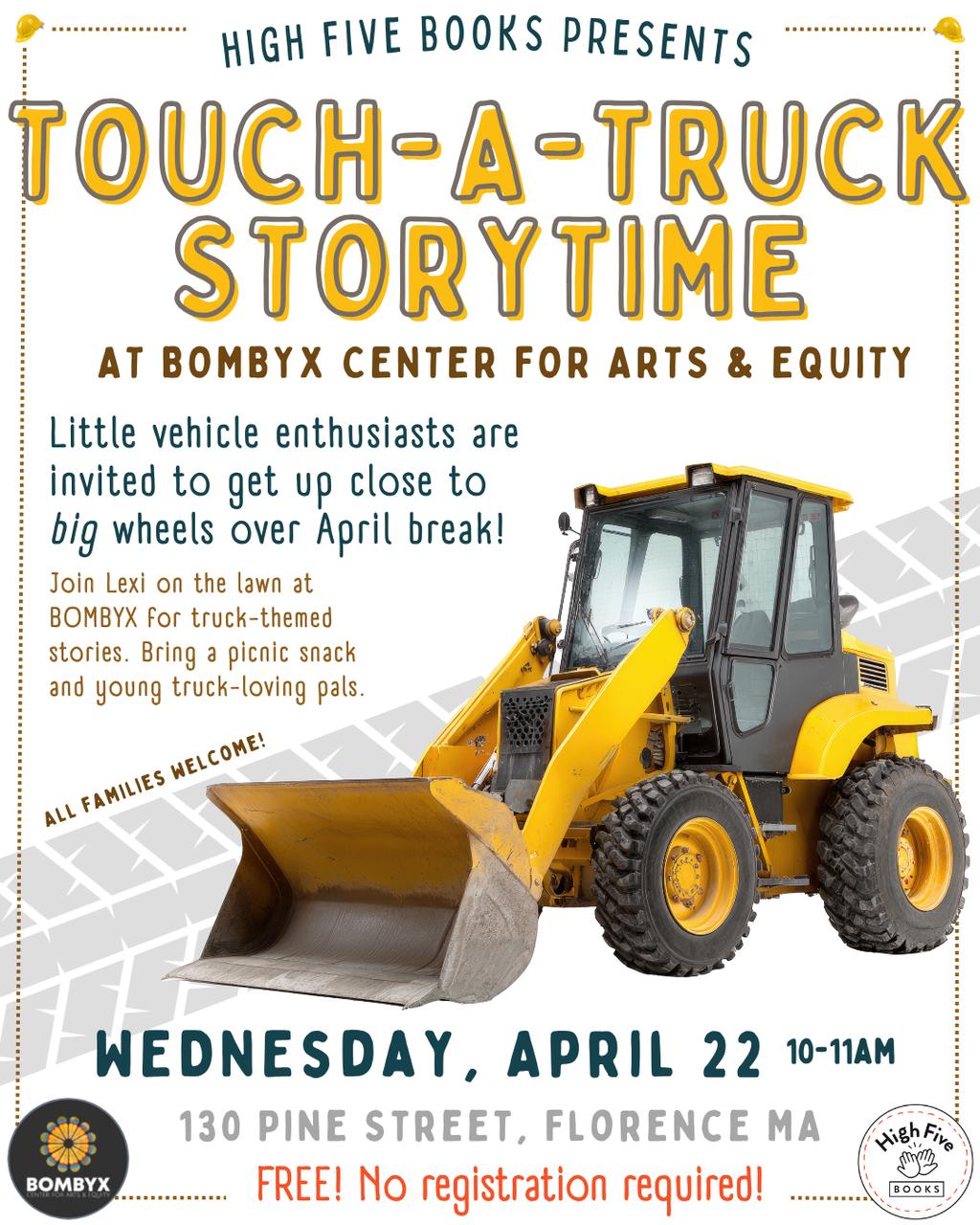 Little vehicle enthusiasts are invited to get up close to big wheels over April break! On April 22, 10-11am, join Lexi from High Five Books on the lawn at BOMBYX Center for Arts & Equity in Florence for truck-themed stories and lots of truck exploration: dump trucks, pickup trucks, a mini excavator, and a tracked skid steer loader.