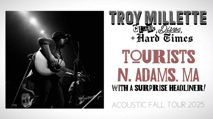 Singer/songwriter Troy Millette (of "Troy Millette & the Fire Below") performs a solo acoustic set as part of his "Clubs, Dives, Hard Times" Fall Tour. WITH SPECIAL SURPRISE HEADLINER! -------------------------------- MORE ABOUT TROY MILLETTE: Vermont’s TROY MILLETTE & THE FIRE BELOW are equal parts thoughtful and lively– a cocktail of rock, pop, folk, and americana music that grapples with love, loss, and the human experience. Millette’s emotive and relatable lyrics, as well as his energetic, banter-filled live performances have made him a staple of dives, clubs, theaters, and festivals across the northeast United States and Quebec. His work as a frontman and solo performer garnered the title of Vermont’s “Best Folk Group” from Seven Days Magazine in 2022 and 2023 (some guy named Noah Kahan beat them in 2024. No big deal). His “Errors Tour” and “Less Than 1% of the World Tour” have taken Millette to more than 20 states since fall 2023. In addition to hundreds of headlining shows, appearances at renowned music festivals such as SXSW, Grace Potter’s Grand Point North, Waking Windows, and Twiddle’s Tumble Down, and a campaign run with Senator Bernie Sanders, Troy Millette and the Fire Below have shared bills with the likes of Counting Crows, Grace Potter, Guster, Bowling for Soup, Matt Quinn (of MT. Joy), Chadwick Stokes (of DISPATCH), LIVE , Richard Marx, Rick Springfield, Wheatus, Brett Dennen, the Revivalists, Steven Page (of Barenaked Ladies), the Marcus King Band, DEER TICK, the Front Bottoms, American Authors, Josiah and the Bonnevilles, Willie Watson, Lee DeWyze, Gabe Dixon, Fantastic Cat, the Ballroom Thieves, and more! The debut solo EP from Troy Millette entitled “Living With A Ghost” is a five-song collection that Seven Days says is “sure to strike a chord with fans of storytelling Americana troubadours such as [Jason] Isbell and the radio-friendly stylings of Kip Moore.” The singles that followed, “I Miss You,” and “Stay (Please)” have received recognition as a “Monthly Best” from Seven Days Magazine and entertainment blog County Tracks. The full-band debut, a cover of Taylor Swift’s “All Too Well,” is available to stream now as well as the original single “In Another Life.” Troy launched his music interview podcast “Load-In Through the Back” with co-host Pauly V in August of 2024, and has featured guests such as Soul Asylum, Five for Fighting, REO Speedwagon, Sierra Hull, Arrested Development, Everclear, and many more! Episodes are now streaming on Spotify, Apple Podcasts, or at their official website: LoadInPodcast.com.