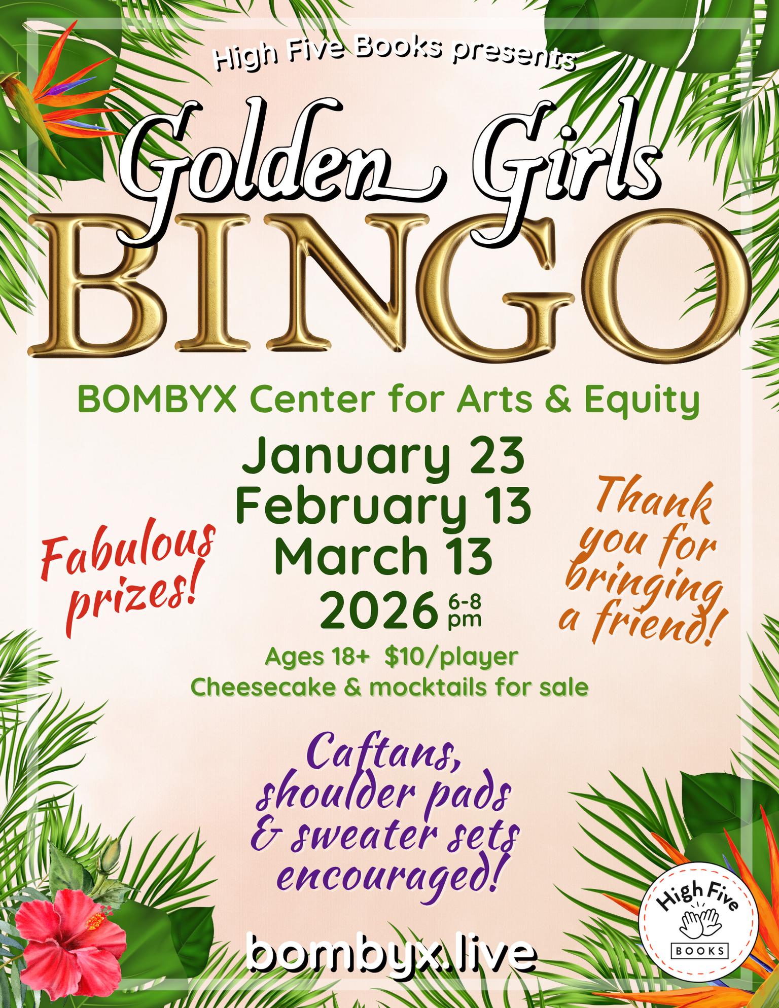 Add some dazzle to the winter darkness with Golden Girls-themed bingo! High Five Books presents three evenings on the lanai at BOMBYX, filled with rowdy bingo, Golden Girls trivia, and laughs with your pals among the palm fronds.