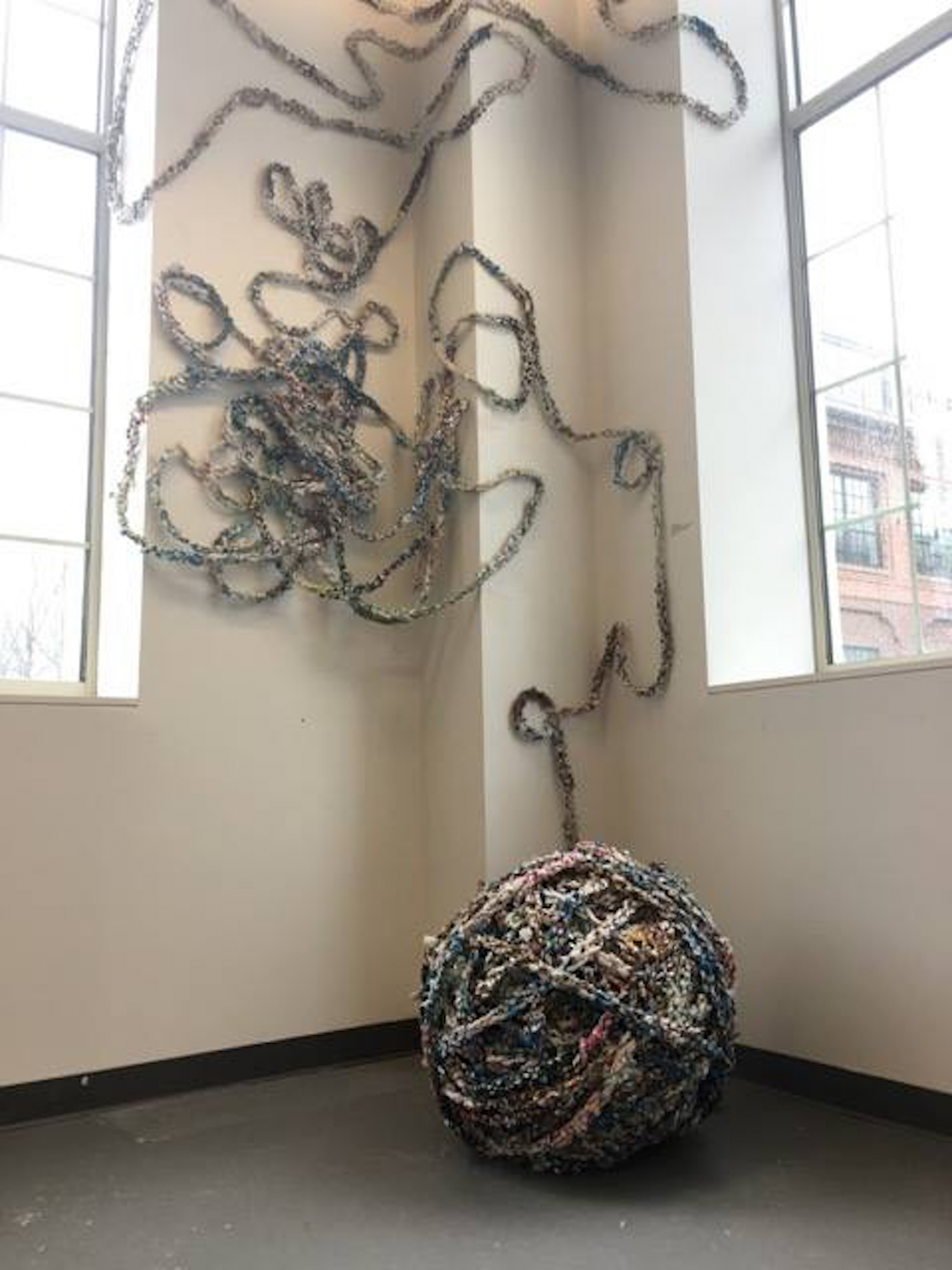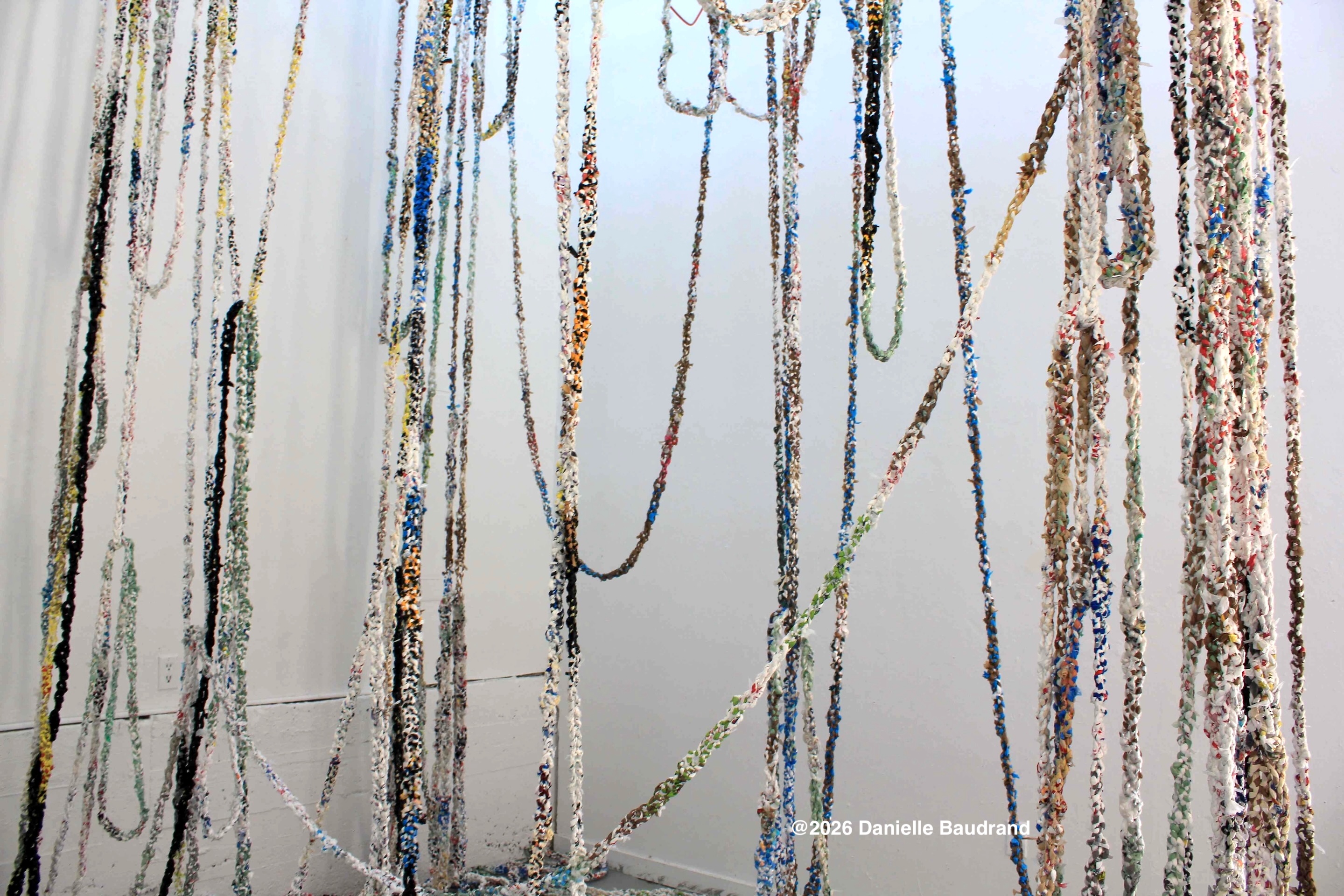 Through labor-intensive processes such as braiding, layering, and crocheting, I challenge conventional perceptions of scale, value, and permanence. Repetition functions both materially and conceptually. Fiber upon fiber and layer upon layer, these rhythmic hand-based movements enact a slow, meditative reclamation of materials designed for disposability. What is intended to be used once and forgotten is elevated into mindful structures with commanding physical presence.